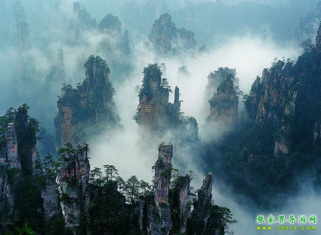 在“后花園”的對面,是一座巍峨的山巒,山上古木參天,遮天蔽日。森林中常有野山羊出沒,夜深人靜之際,常能聽到野羊羔“咩洋”地叫聲,因此被稱作“羊寨”。民國時期,此地曾為土匪占領(lǐng),直到現(xiàn)地,山上還殘留有卡門、暗堡、斷壕、屋場、水井、碓臼、磨坊等殘跡。粗大的松樹上還留有土匪當年留下的“V”字型標志。站在“山寨”上,舉目眺望,可看見金鞭溪全景,只見一條美麗的溪水從數(shù)百座石林中緩緩穿過,顯得是那樣的幽靜、和諧。從“后花園”向前步行約100米,便是袁家界又一處絕世奇觀——迷魂臺,走上迷魂臺,只見上百座山巒拔地而起,峰涌而至,它們姿態(tài)萬千、氣勢非凡;有的似“天狗望月”,有的像“海螺出水”;有的像“將軍列隊”,有的如“一柱擎天”。幾道山坳和屏障將這些山巒有序的分開,使這些石峰更顯得層次分明,井然有序,在萬道霞光的點綴下,顯得蔚為壯觀,不同凡響。這更像是一幅畫家筆下的水墨丹青,“迷魂臺”攬勝,真宛如仙境神游啊。