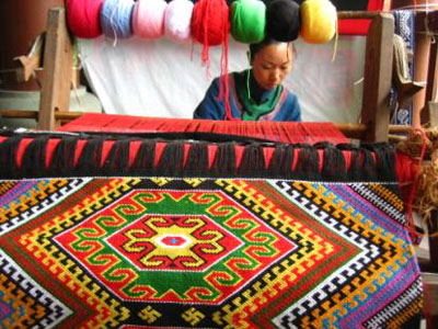 土家織錦是土家婦女用一種古老的木腰機(jī),以棉紗為經(jīng),對(duì)五彩絲線或棉線(當(dāng)今也有用毛線的) 為緯,完全用手工織成的手工藝術(shù)品。