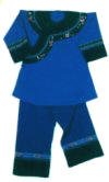,外套青色滿肩馬褂,腰系桃花兜,并配撤穗荷包,下著青色寬腳褲,腳穿白布襪子和天官云頭鞋。婦女頭上蒙白色繡花帕,兩耳垂環(huán),手戴鐲子或戒指,外套繡花圍裙,用繡花飄帶系著,右上胸佩掛三吊或五吊銀質(zhì)牙簽。下著蘭色寬褲,腳纏白色裹腳布,穿繡花尖尖鞋。無婚女性則挽“簪巴”,挽于腦后的稱“粑粑”,挽于頭頂?shù)姆Q高把簪,簪上套有網(wǎng),橫插簪子;兒童衣服多繡花,外圍肚兜,頭戴虎頭鼓針菩薩帽,頸戴“項(xiàng)圈”、“百家鎖”等,手腕套有銀圈,上系小吊,吊上有錘、鈴、鞋、斧、簽等。