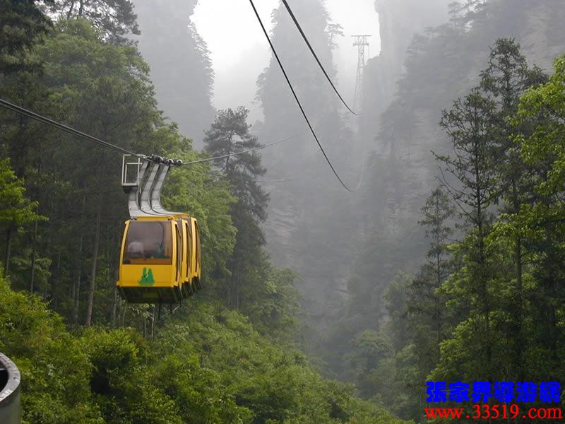 (索道站)現(xiàn)在,我們就要乘索道下山了。黃石寨(黃獅寨)索道是1995年5月至1997年9月臺(tái)灣證吉興業(yè)有限公司與張家界公園管理處合資興建的我市第一條觀光索道。索道線路水平距863,高差431米,運(yùn)行速度每秒8米,單向小時(shí)運(yùn)量948人,設(shè)備全部從法國(guó)波馬公司引進(jìn),總投資4000多萬(wàn)人民幣。黃石寨(黃獅寨)索道的建成,為公園開辟了一條空中游覽線,填補(bǔ)了張家界無(wú)觀光索道的空白。古詩(shī)說(shuō):會(huì)當(dāng)凌絕頂,一覽眾山小。乘索道觀張家界公園,別是一番感受。
