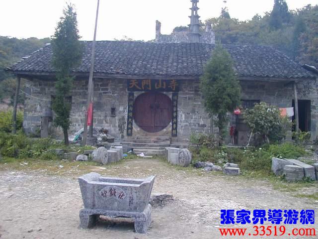 (天門山寺)天門山寺最早建于唐代,古稱云缽庵、靈泉院、嵩梁堂,明代時,因擇址不當而屢遭風摧又常遭水荒,才將天門山寺從東部山頂遷移至此。以前這里古木參天,濃蔭蔽日。古寺門楣上刻有“天門仙山”四字,大門兩邊的對聯(lián)是:“天外有天天不夜,山上無山山獨尊”,傳為李自成部將野拂撰書。進門為大佛殿后面有觀音堂,兩邊六間平房,最后一棟是祖師殿,規(guī)模宏大。民間概括為“三進堂、六耳房,磚墻鐵瓦鍋如壙”。山寺原建筑十分講究,飛檐翹角,雕龍畫鳳,并塑有佛道神像菩薩等。還有大鼓一面,千斤大鐘一口,一座七級石塔和一個大化錢爐。據(jù)碑刻記載,自清乾隆至民國五年的163年間,天門山寺共修葺過七次,香火曾盛極一時,湘鄂川黔邊境十多個縣的信徒絡繹不絕,都來這里進香拜佛?,F(xiàn)天門山旅游股份有限公司正在大規(guī)模地修復天門山寺,昔日的繁華又將重現(xiàn)。