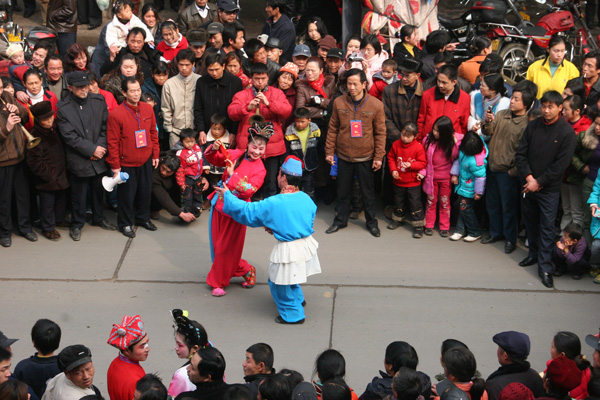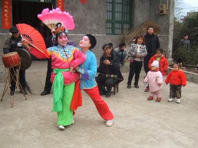 一旦一丑表演,用手巾和折扇作道具。旦的表演含蓄細膩,動作優(yōu)美輕俏,以眉目傳情(脧眉眼)為特點。丑的表演活潑聰明,俏皮逗樂,動作粗獷。流傳在境內(nèi)的地花鼓有“洗菜心”、“銅錢歌”、“望郎歌”等。