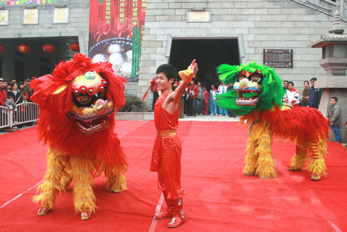 有布獅和毛獅兩種,舞時又分文獅和武獅。文獅刻畫獅子溫馴神態(tài),動作詼諧細膩;武獅顯獅子勇猛,動作幅度強。舞獅的套子有“藤纏樹”、“烏云蓋雪”、“牛戀凼”、“泥鰍彈鍋”、“麒麟送子”等。用打擊樂和吹奏樂伴奏、氣氛熱烈莊重。舞獅時還有贊獅者伴唱,唱詞內(nèi)容有反映勞動生活、祝賀吉祥、介紹傳說故事等,舞獅者隨唱詞內(nèi)容和節(jié)奏進行表演。