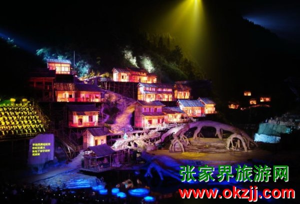 是目前世界第一臺(tái)有完整故事情節(jié)的山水實(shí)景音樂歌舞劇。舞臺(tái)選址在天門山風(fēng)景區(qū)山門口內(nèi)至天門山頂?shù)恼麠l峽谷,總投資達(dá)到1.2億元,演員隊(duì)伍達(dá)530多人。主舞臺(tái)以10000平米的玻璃鋼打造,是目前世界最大的全景玻璃鋼舞臺(tái)。