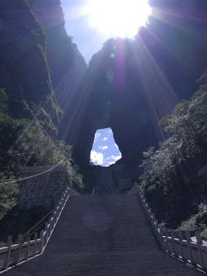 洞,這一大自然的造物杰作,嵌于千米絕壁之上,如明鏡高懸,似天門(mén)獨(dú)啟,一年四季吐納云霧雷電,充滿(mǎn)著天宮帝閣的神秘感,其真正的形成原因至今還沒(méi)有令人信服的科學(xué)解釋.