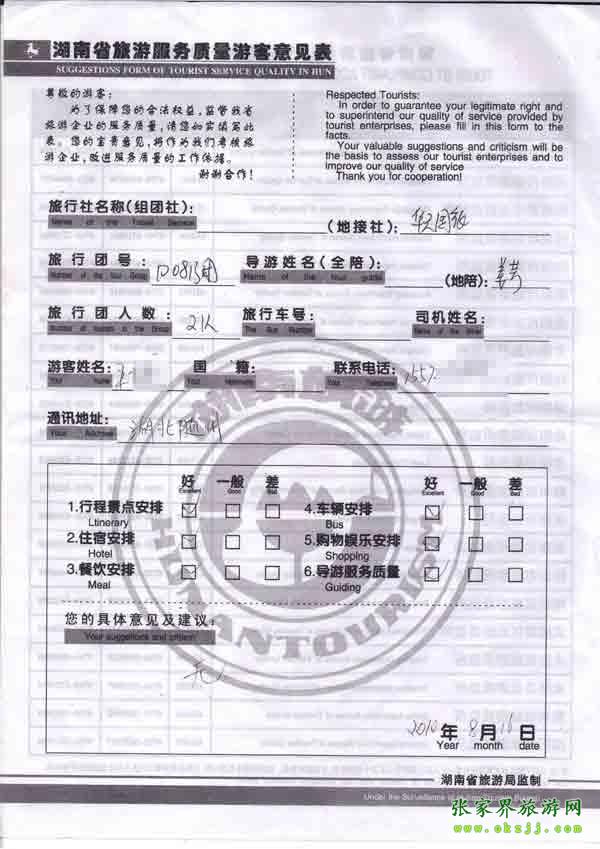2010年8月16日湖北王先生一行21位旅游質量反饋