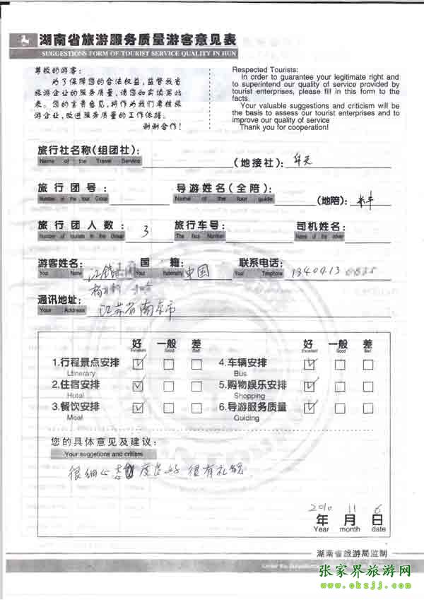 2010年11月6日江蘇楊小姐一行3位旅游質量反饋:很細心,態(tài)度好,很有禮貌