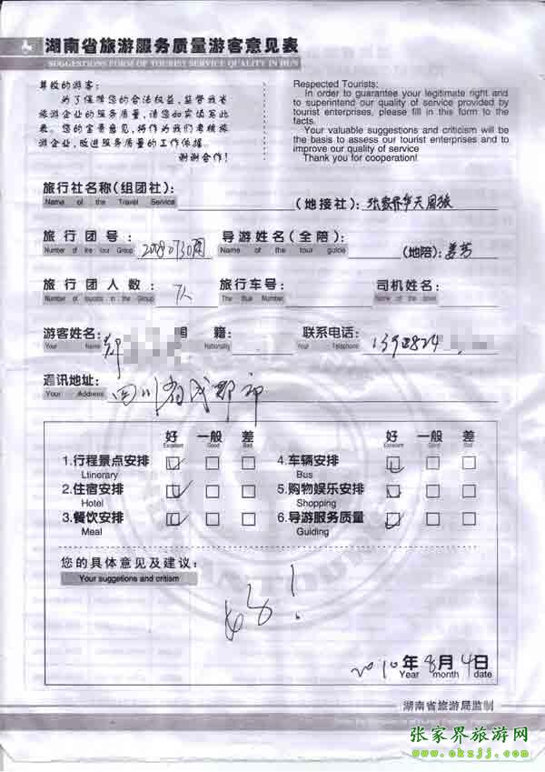 2010年8月4日成都鄭先生一行7位貴賓旅游質量反饋