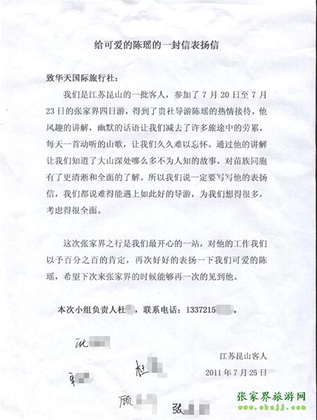 - 游客夏先生為表揚導游李姣姣寫來表揚信致我張家界... [14811]
