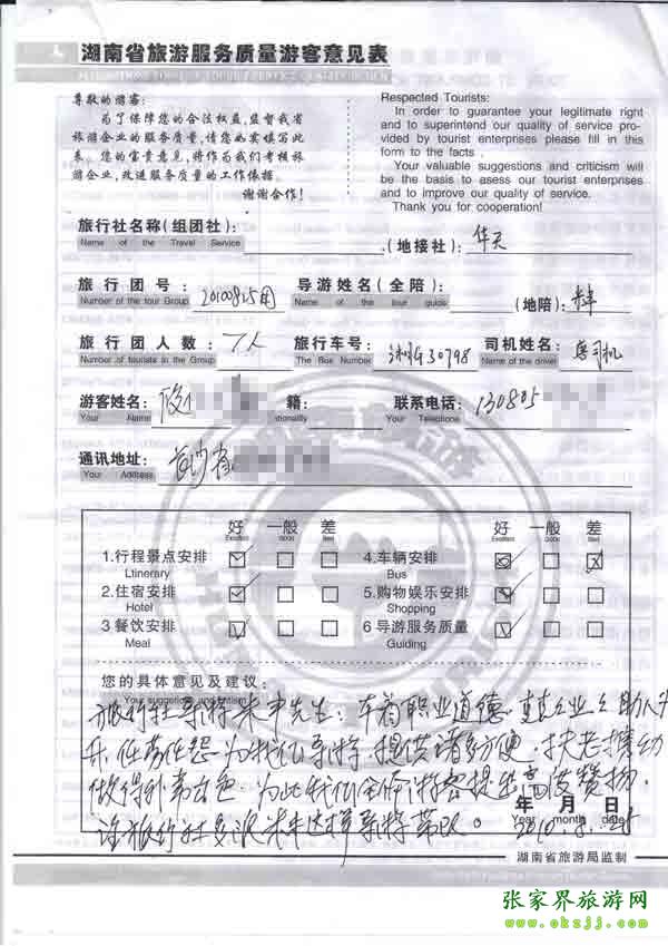 2010年8月25日長(zhǎng)沙攸小姐一行7位旅游質(zhì)量反饋:導(dǎo)游特別優(yōu)秀