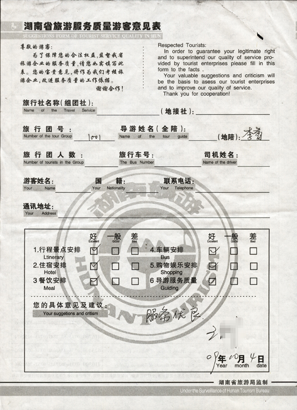 2009年10月1日王先生一行質(zhì)量接待反饋單: