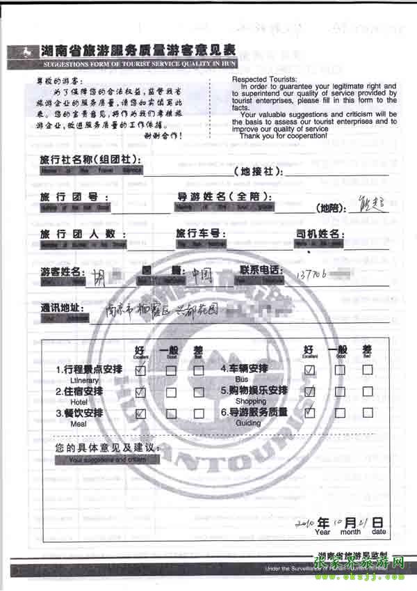 2010年10月21日胡先生旅游質(zhì)量反饋