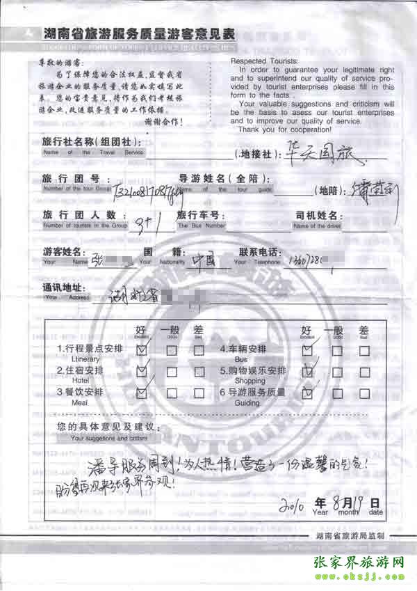 2010年8月19日湖北張先生一行九位旅游點(diǎn)評(píng):導(dǎo)游服務(wù)周到熱情,盼下次再來張家界