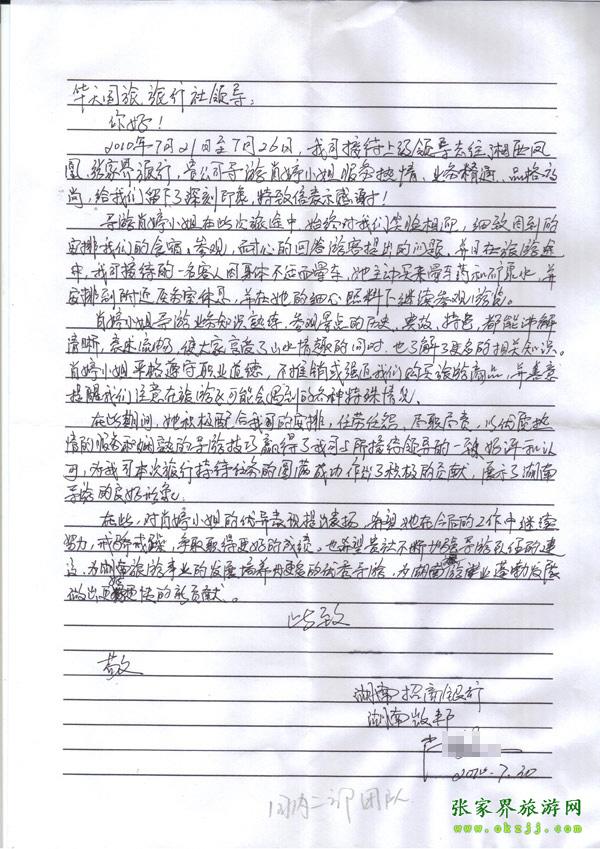 - 游客夏先生為表?yè)P(yáng)導(dǎo)游李姣姣寫(xiě)來(lái)表?yè)P(yáng)信致我張家界... [14811]