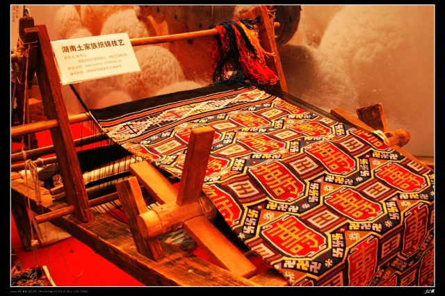 土家織錦,就是土家姑娘用一種古老的木腰機(jī),以棉紗為經(jīng),對(duì)五彩絲線或棉線(當(dāng)今也有用毛線)為緯,完全用手工織成的手工藝術(shù)品。土家織錦的藝術(shù)品種,經(jīng)過(guò)一兩千年的演變,現(xiàn)在已發(fā)展到100多個(gè),除原有的“西蘭卡普”(即被面花)以外,又根據(jù)時(shí)代的變化織出了各種圖案的壁掛、香袋、服飾、旅游袋、沙發(fā)套、坐墊、地毯、室內(nèi)裝飾等多種工藝美術(shù)品。聰明的土家姑娘,她們心靈手巧,表現(xiàn)山水,表現(xiàn)人物,表現(xiàn)樹木花卉與飛禽走獸,形象逼真,栩栩如生。 土家織錦產(chǎn)區(qū)主要分布在龍山縣苗兒灘、張家界、撈車及靛房、坡腳;永順縣縣對(duì)山、風(fēng)棲;保靖縣的普絨、清水等地。春秋戰(zhàn)國(guó)時(shí)期,“表布”(即土家錦)即已成為貢品。