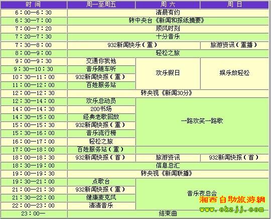 張家界旅游交通頻道茲定于四月八號試播,頻率為FM93.2兆赫和103.2兆赫。頻道以立足旅游交通、服務(wù)百姓大眾為宗旨,設(shè)置了《清晨有約》、《順風(fēng)時(shí)刻》、《932新聞快報(bào)》、《輕松之旅》、《交通你我他》、《百姓服務(wù)站》、《歡樂總動(dòng)員》和《音樂隨車聽》等欄目。屆時(shí),聽眾可以通過熱線電話、短信平臺(tái)以及網(wǎng)絡(luò)廣播等多種途徑參與到電臺(tái)節(jié)目中來,在第一時(shí)間了解新聞動(dòng)態(tài),掌握市場信息,享受娛樂休閑。 直播熱線:0744——2116999 熱線電話:0744——2116777 廣告熱線:0744——8235800 怎樣收聽張家界旅游交通頻道FM93.2